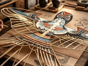 The artisan selects flexible yet sturdy bamboo, often from the Mao bamboo species. The bamboo is split, shaved, and bent over a flame to form a light and balanced skeleton. The frame must be symmetrical and precisely calibrated to ensure stable flight.