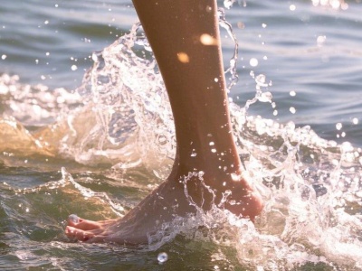 20-25秒提示词:人物赤足踩浪花,慢动作展现水花飞溅轨迹,透明水花+粉金色高光。