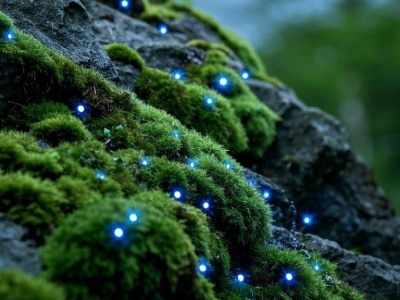 15-20秒提示词:微距镜头下的潮湿岩石,青苔随呼吸节奏发光,墨绿苔藓+荧光蓝光点。