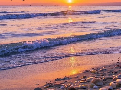 10-15秒提示词:俯视海岸线全景,落日余晖将海浪染成橙紫色,橙紫渐变天空+深蓝海水,沙滩发光贝壳群、海鸟剪影。