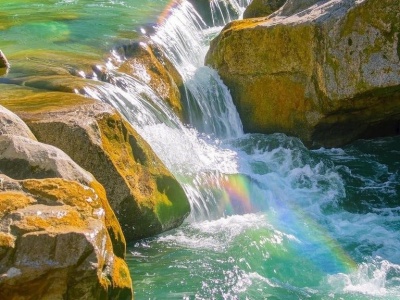5-10秒提示词:山涧溪流特写,水流冲刷鹅卵石泛起彩虹光晕,翡翠色水面+琥珀色岩石。