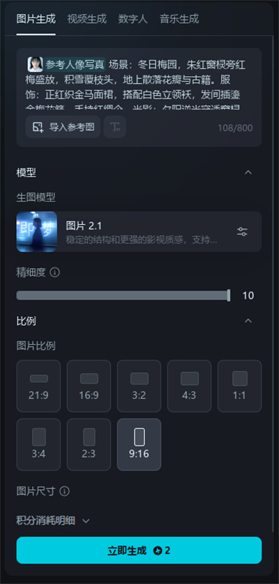 模型选 图片2.1 Pro ,比例9:16(竖屏),精细度拉满 。
