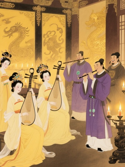 图片提示词:中国水墨画,张大千风格,齐白石画风,几位身着鹅黄色宫装、头戴凤冠的古代女子,与身着紫袍、腰佩玉佩的男子,在金碧辉煌、烛火通明的宫殿中。女子们手持箜篌弹奏,男子们吹笙,笑容满面。宫殿的墙壁上绘有吉祥瑞兽图案。
