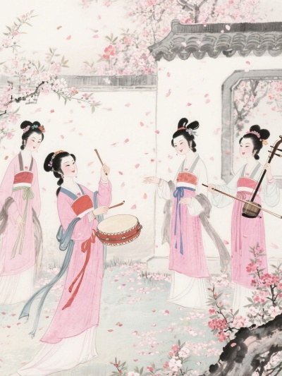 图片提示词:中国水墨画,张大千风格,齐白石画风,几位身着粉色襦裙、腰系丝带的古代女子,梳着双鬟髻,在繁花似锦、落英缤纷的庭院中,一位女子轻敲腰鼓,另一位女子手持二胡拉奏,表情愉悦。周围繁花随风飘落,增添喜庆之感。
