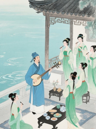 图片提示词:中国水墨画,张大千风格,齐白石画风,身着蓝色长衫、头戴方巾的古代书生,与身着翠绿罗裙、发簪步摇的女子们,在古色古香、摆满精致茶点的水榭之中。书生们弹着琵琶,女子们轻唱小曲,笑靥如花。水榭外湖水波光粼粼。