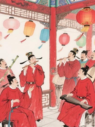 图片提示词:中国水墨画,张大千风格,齐白石画风,一群身着华丽红色锦袍的古代男子,头戴束发冠,在雕梁画栋、红灯高挂的亭台楼阁中,有的男子手持竹笛吹奏,有的抚琴弹奏,脸上洋溢着喜悦。背景有五彩的灯笼随风摇曳,营造出热闹喜庆的氛围。