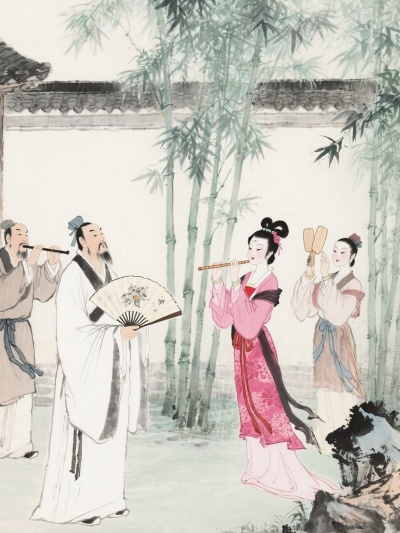 图片提示词:中国水墨画,张大千风格,齐白石画风,身着素白长袍、手持折扇的古代雅士,与身着玫红色绮罗、梳着高髻的女子,在清幽雅致、翠竹环绕的庭院中。雅士们吹箫,女子们打着快板说唱,竹影摇曳,充满喜庆气息。