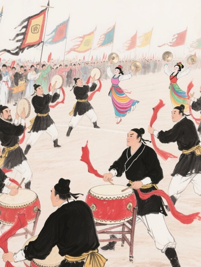 画面动起来提示词:擂鼓的男子手臂高高扬起,重重落下,鼓面震动,红绸舞动如火焰,女子手中铃鼓响声清脆,步伐轻盈,旗帜在风中烈烈作响,展现出热烈喜庆的动态场景。